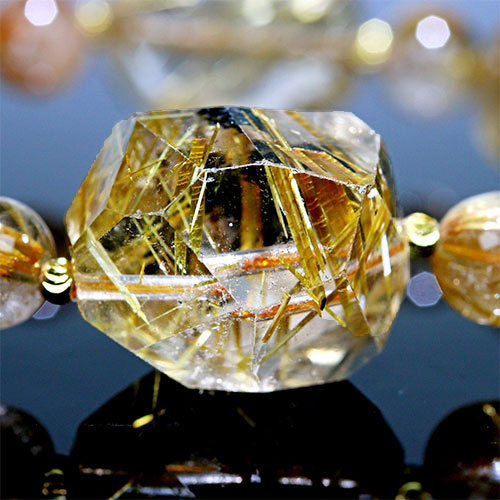 スモーキークォーツ(茶水晶)が混じることでうっすらと茶色がかった非常に透明感のある水晶に、黒いヘマタイトの部分からギラギラとひときわ鮮やかな黄金の輝きを放つ極太のタイチンルチルが太陽の光のように放射状に生えているのが確認できるとても美しい最高級パワーストーンブレスレットです。