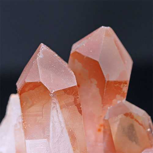 タンジェリンクォーツは、表面にヘマタイト(酸化鉄)成分が付着し、それが酸化した水晶です。表明層に取り込まれていたゲーサイトが、美しいオレンジ色を見せていますが中身は透明な水晶です