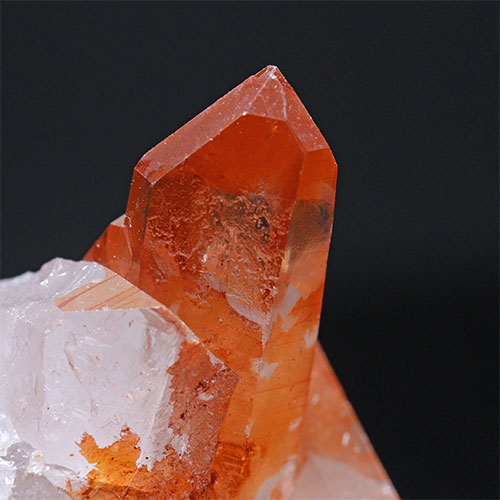 タンジェリンクォーツは、表面にヘマタイト(酸化鉄)成分が付着し、それが酸化した水晶です。表明層に取り込まれていたゲーサイトが、美しいオレンジ色を見せていますが中身は透明な水晶です