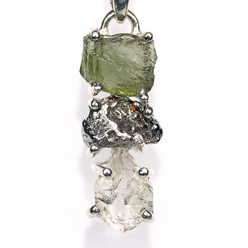 鉄隕石、「モルダバイト」原石、ハーキマーダイヤモンドのレアストーン3石の組み合わせが魅力的なシルバー925製ペンダントトップです。