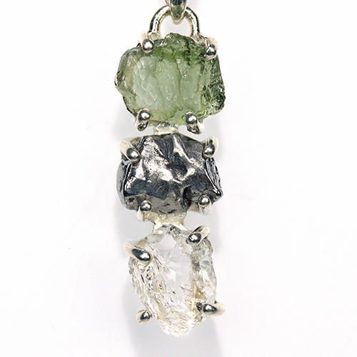 鉄隕石、「モルダバイト」原石、ハーキマーダイヤモンドのレアストーン3石の組み合わせが魅力的なシルバー925製ペンダントトップです。