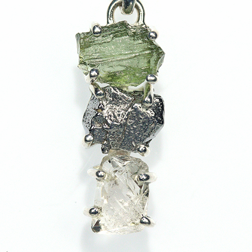 鉄隕石、「モルダバイト」原石、ハーキマーダイヤモンドのレアストーン3石の組み合わせが魅力的なシルバー925製ペンダントトップです。