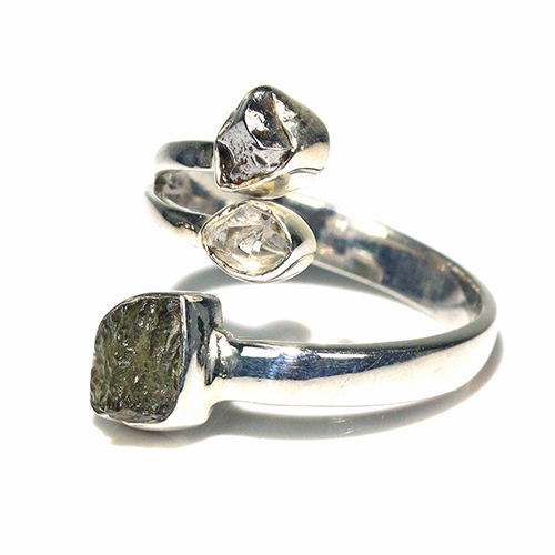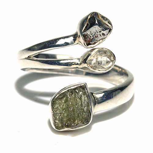 鉄隕石、「モルダバイト」原石、ハーキマーダイヤモンドのレアストーン3石の組み合わせが魅力的なシルバー925製リングです。