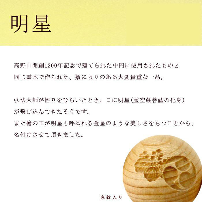本品は、高野山・中門にゆかりを持つ霊木「明星(みょうじょう)」を用いて仕立てた、家紋入りの特別なブレスレットです