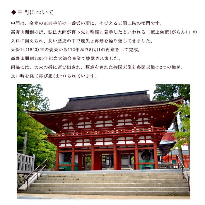 高野山は、弘法大師・空海が開いた真言密教の聖地。中門は、俗世と聖域を分かつ結界の門として、古くから重要な意味を持つ場所です。