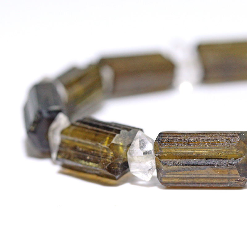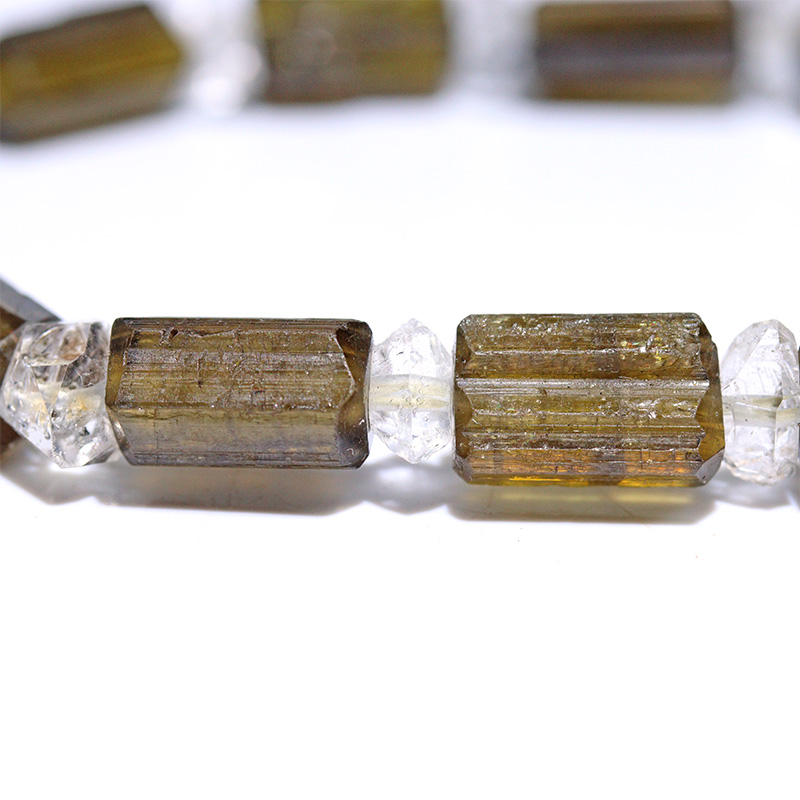 深みのあるグリーンブラウンが美しいダイオプサイトと、透明感あふれるハーキマーダイヤモンドを組み合わせたブレスレットです。原石の風合いを感じさせるダイオプサイトの柱状カットが個性的で、間に配したハーキマーダイヤモンドの輝きが洗練された印象を与えます。