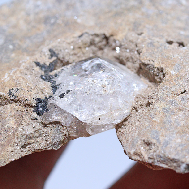 ハーキマーダイヤモンドは、ドロマイト(苦灰岩)という硬い岩石の母岩の中にできた空洞部分に、柱面の一部分が接触して成長しています。その形成は、4億5000年から5億年前と言われています。