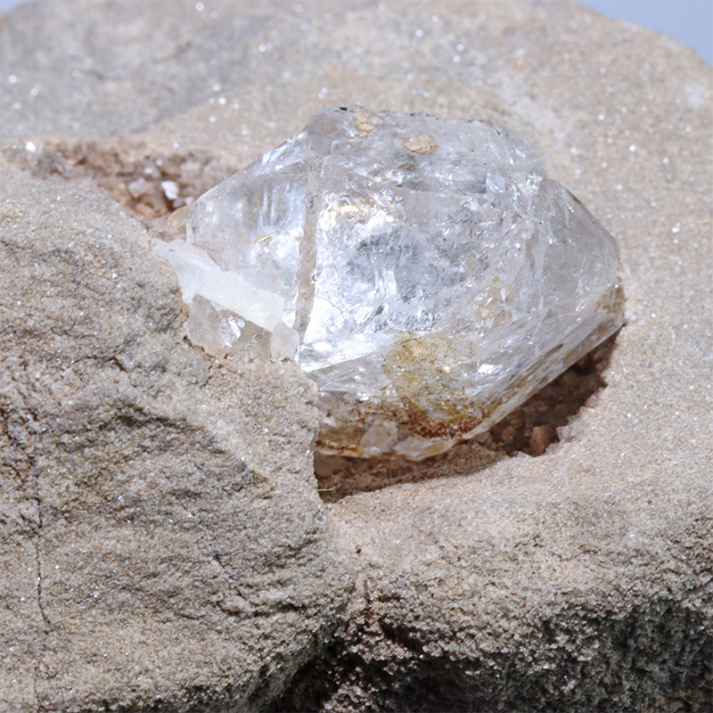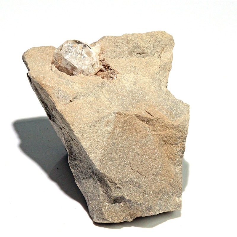 ハーキマーダイヤモンドは、ドロマイト(苦灰岩)という硬い岩石の母岩の中にできた空洞部分に、柱面の一部分が接触して成長しています。その形成は、4億5000年から5億年前と言われています。