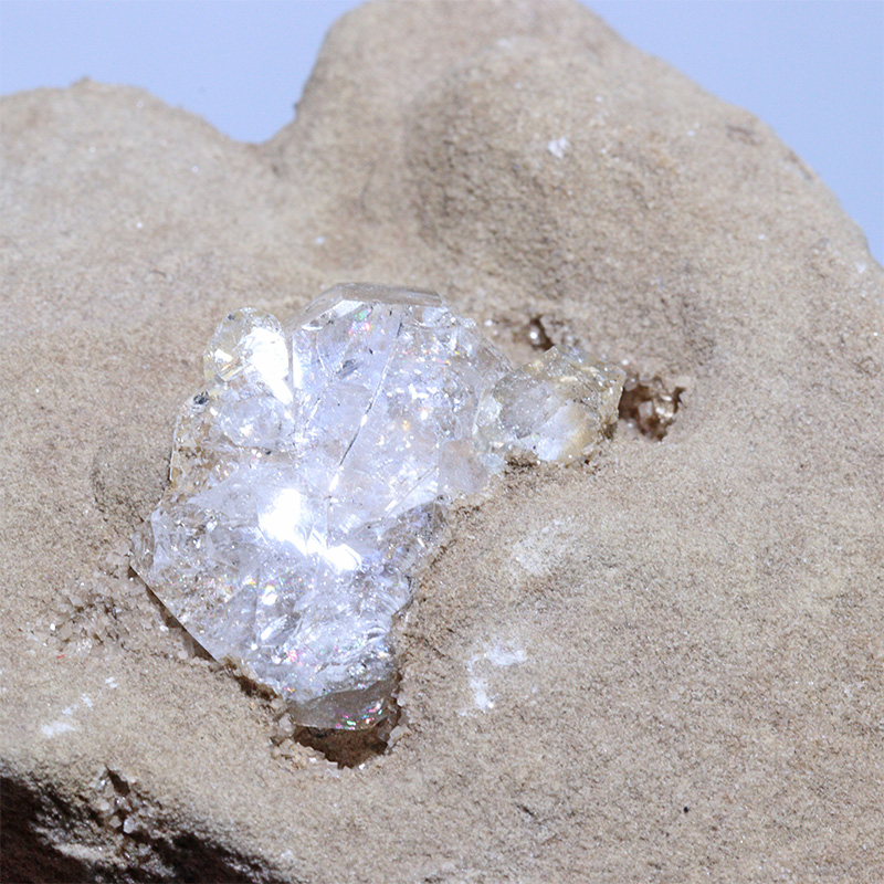 ハーキマーダイヤモンドは、ドロマイト(苦灰岩)という硬い岩石の母岩の中にできた空洞部分に、柱面の一部分が接触して成長しています。その形成は、4億5000年から5億年前と言われています。