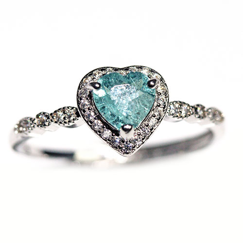 透明感のあるブルートルマリンを中心に、周囲には繊細に輝くストーンをあしらい、上品さの中に可愛らしさも感じられるデザインに仕上がっています。