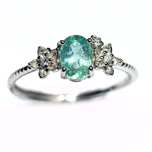 透明感のあるブルートルマリンを中心に、周囲には繊細に輝くストーンをあしらい、上品さの中に可愛らしさも感じられるデザインに仕上がっています。
