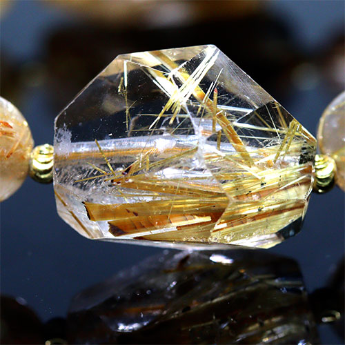 スモーキークォーツ(茶水晶)が混じることでうっすらと茶色がかった非常に透明感のある水晶に、黒いヘマタイトの部分からギラギラとひときわ鮮やかな黄金の輝きを放つ極太のタイチンルチルが太陽の光のように放射状に生えているのが確認できるとても美しい最高級パワーストーンブレスレットです。