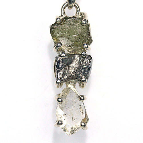 鉄隕石、「モルダバイト」原石、ハーキマーダイヤモンドのレアストーン3石の組み合わせが魅力的なシルバー925製ペンダントトップです。