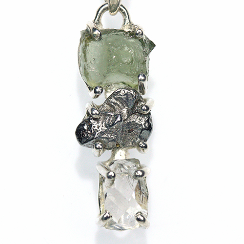 鉄隕石、「モルダバイト」原石、ハーキマーダイヤモンドのレアストーン3石の組み合わせが魅力的なシルバー925製ペンダントトップです。