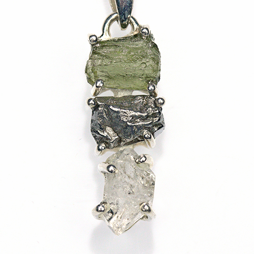 鉄隕石、「モルダバイト」原石、ハーキマーダイヤモンドのレアストーン3石の組み合わせが魅力的なシルバー925製ペンダントトップです。