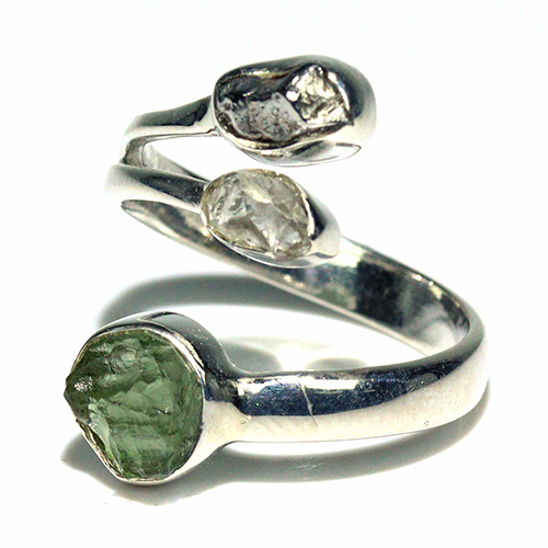 鉄隕石、「モルダバイト」原石、ハーキマーダイヤモンドのレアストーン3石の組み合わせが魅力的なシルバー925製リングです。