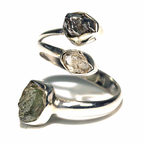 鉄隕石、「モルダバイト」原石、ハーキマーダイヤモンドのレアストーン3石の組み合わせが魅力的なシルバー925製リングです。