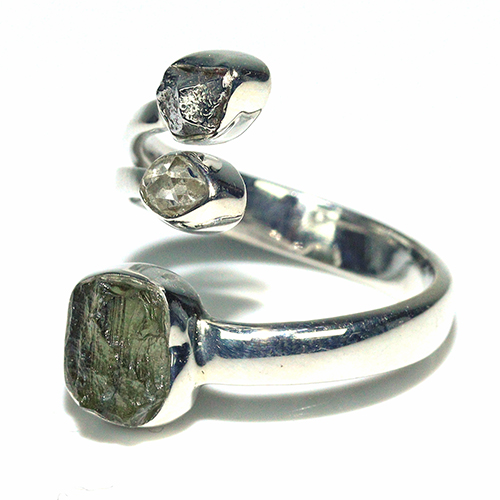 鉄隕石、「モルダバイト」原石、ハーキマーダイヤモンドのレアストーン3石の組み合わせが魅力的なシルバー925製リングです。
