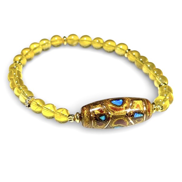 深い意味を持つ吉祥文様と、光を受けて青く輝く神秘の琥珀が融合した、存在感あふれる開運ブレスレットです。