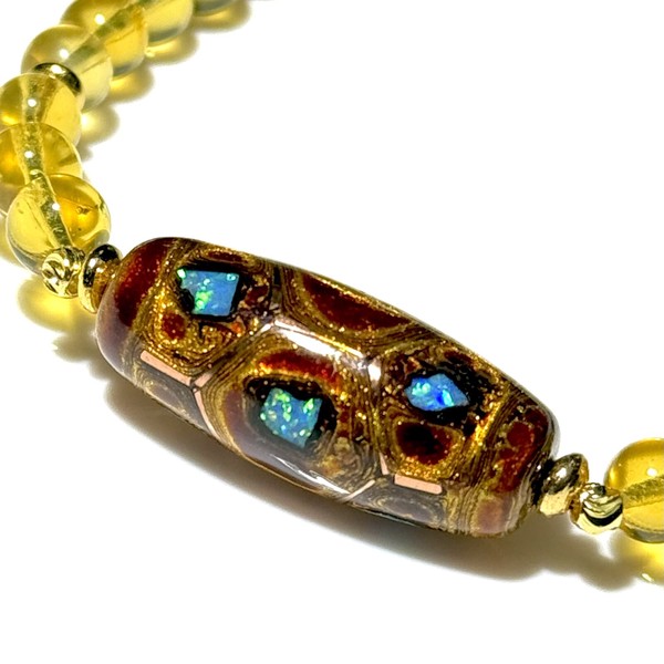 神秘の輝きを放つ亀甲長寿大漆オパール天珠に、透明感あふれるブルーアンバーを組み合わせた特別な一本。