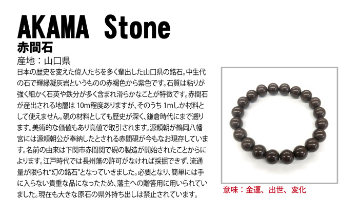 赤間石は山口県下関市(旧・長門国赤間関周辺)でのみ産出する国産石で、他地域ではほぼ確認されていません。いわゆる“完全な地域限定石”です。