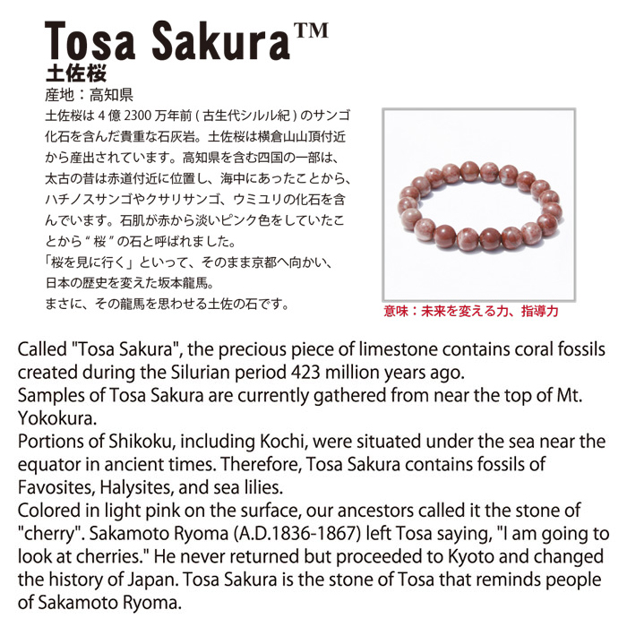 桜は古来より“繁栄”“門出”“吉兆”の象徴。土佐桜石はそのやわらかなエネルギーで持つ人を包み込み、穏やかで上品な魅力を引き出してくれるといわれています。
