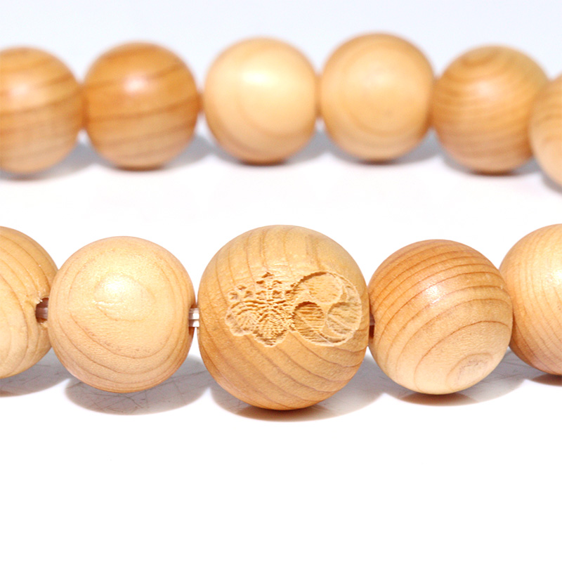 本品は、高野山・中門にゆかりを持つ霊木「明星(みょうじょう)」を用いて仕立てた、家紋入りの特別なブレスレットです