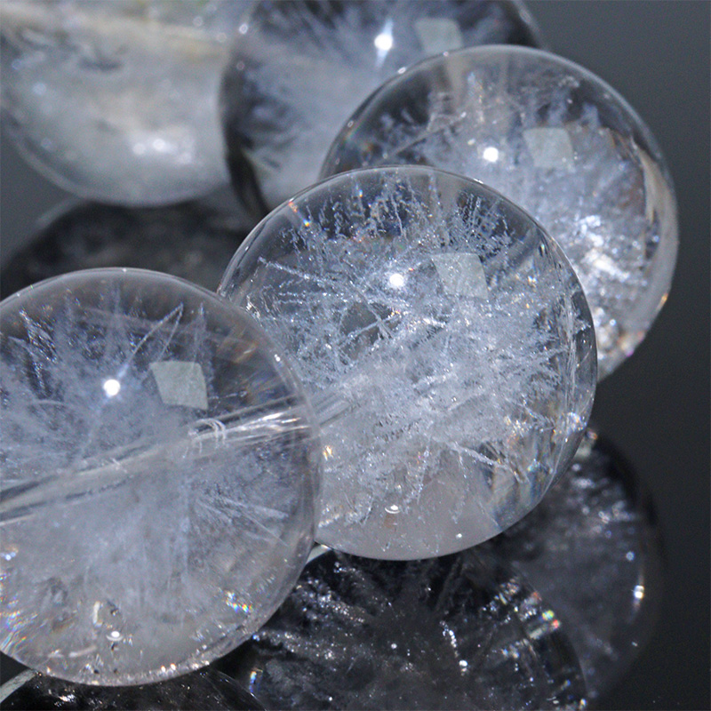 透明度の高い天然水晶に、特殊な加工を施すことで、内部に放射状の白い結晶模様を生み出しています