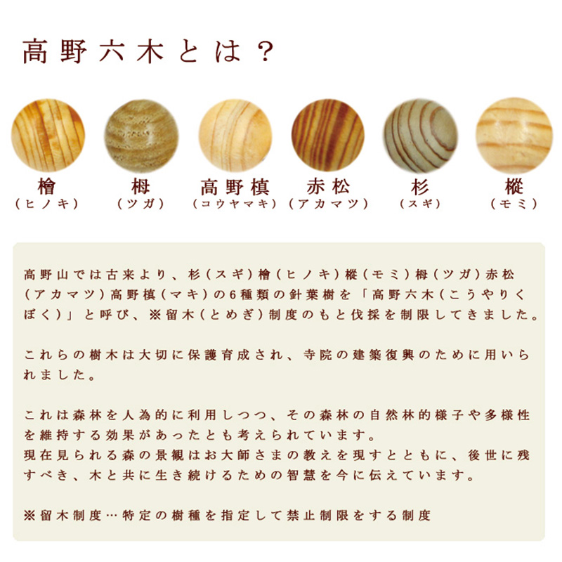 高野山では古来より、杉(スギ)檜(ヒノキ)樅(モミ)栂(ツガ)赤松(アカマツ)高野槙(マキ)の6種類の針葉樹を「高野六木(こうやりくぼく)」と呼び、※留木(とめぎ)制度のもと伐採を制限してきました。