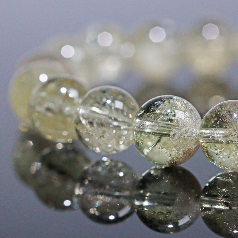 このブレスレット同士をそっと触れ合わせると、シャラシャラと澄み渡る高音の音色が響きます。その音はとても軽やかで透明感があり、まるで水晶が奏でる小さな鈴のような美しい響きです。